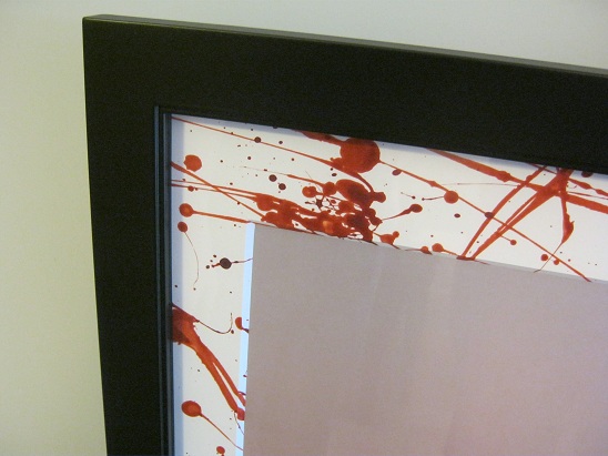 I framed my girlfriend’s Dexter poster at work the other day. The mat I had in mind to use was a dark red suede mat, but when I put the mat over the poster it was obvious the reds wouldn’t match. I asked my boss for advice and he suggested just using a plain 8-ply white mat. I thought that was a little too boring, but then I remembered I still had some fake blood from Halloween. This is the end result.