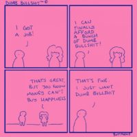 Also, why in hell, when someone is happy just about having money, someone must utter that dumb phrase, about “not being able to buy happiness” ? Was he glad that now he can buy “Hapiness Deluxe”, or that custom made “Happines Platinum Pro” ? No, he was happy about something entirely else, but the “responder” is either trying to tell his own story\projecting, or braindeadly trained by “society”.