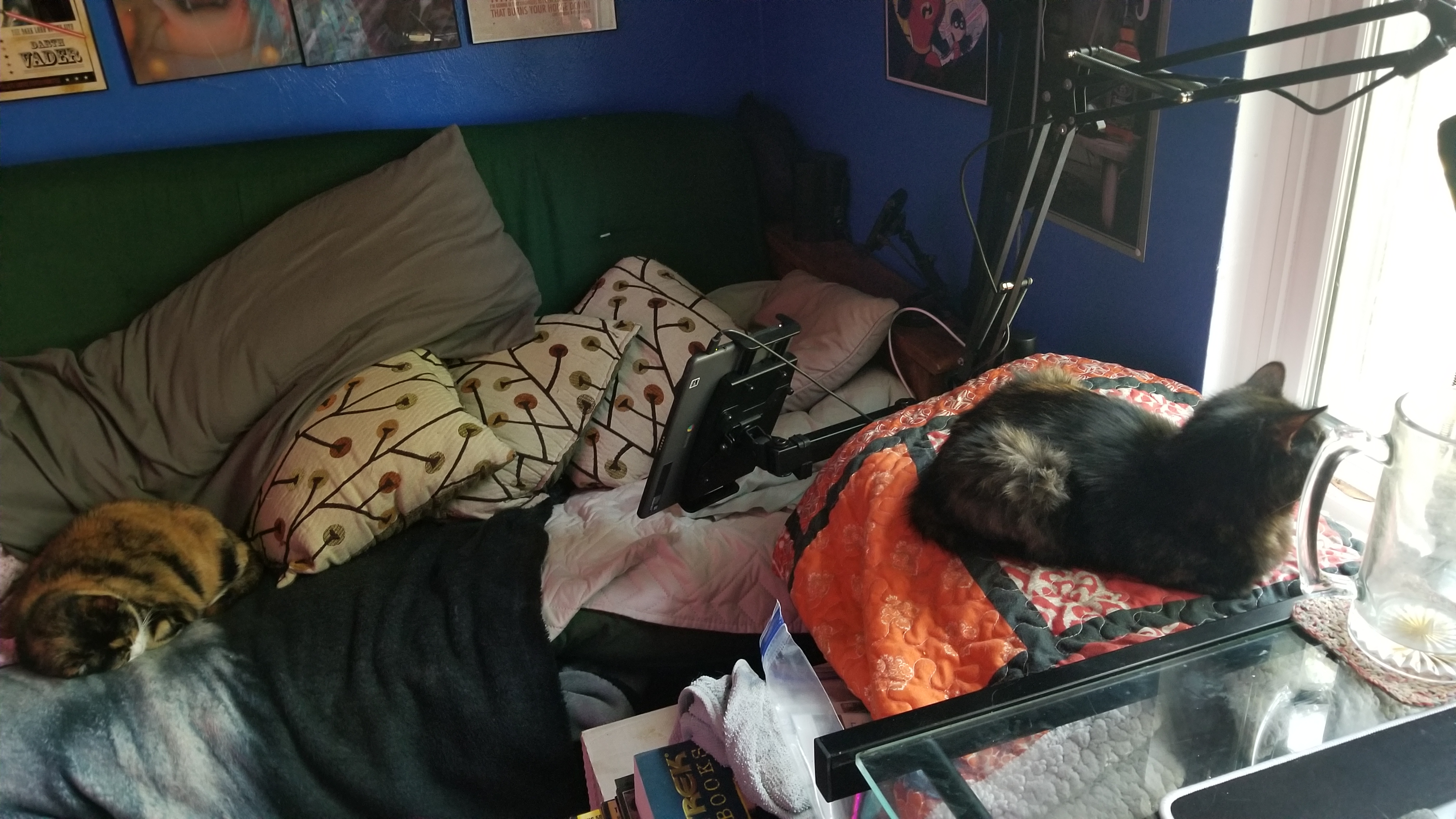 Two cats and my temporary sleeping spot while I figure some snoring issues out.