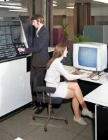 Sideburns, mini skirts and big old computers at the Atlas Computer Laboratory in Harwell. England, 1971.