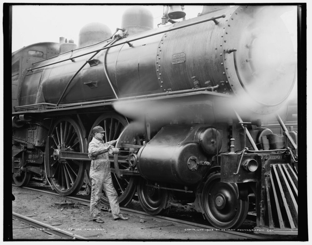 An engineer oils up a steam engine before startup, c.1904 [3000 x 2354]