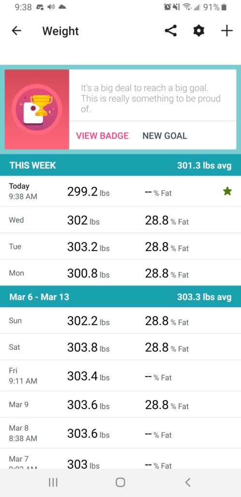 I’m now officially under 300 pounds again, last time I was this light was when I got married in 2013. My plan is to keep losing to my BP naturally lowers too.